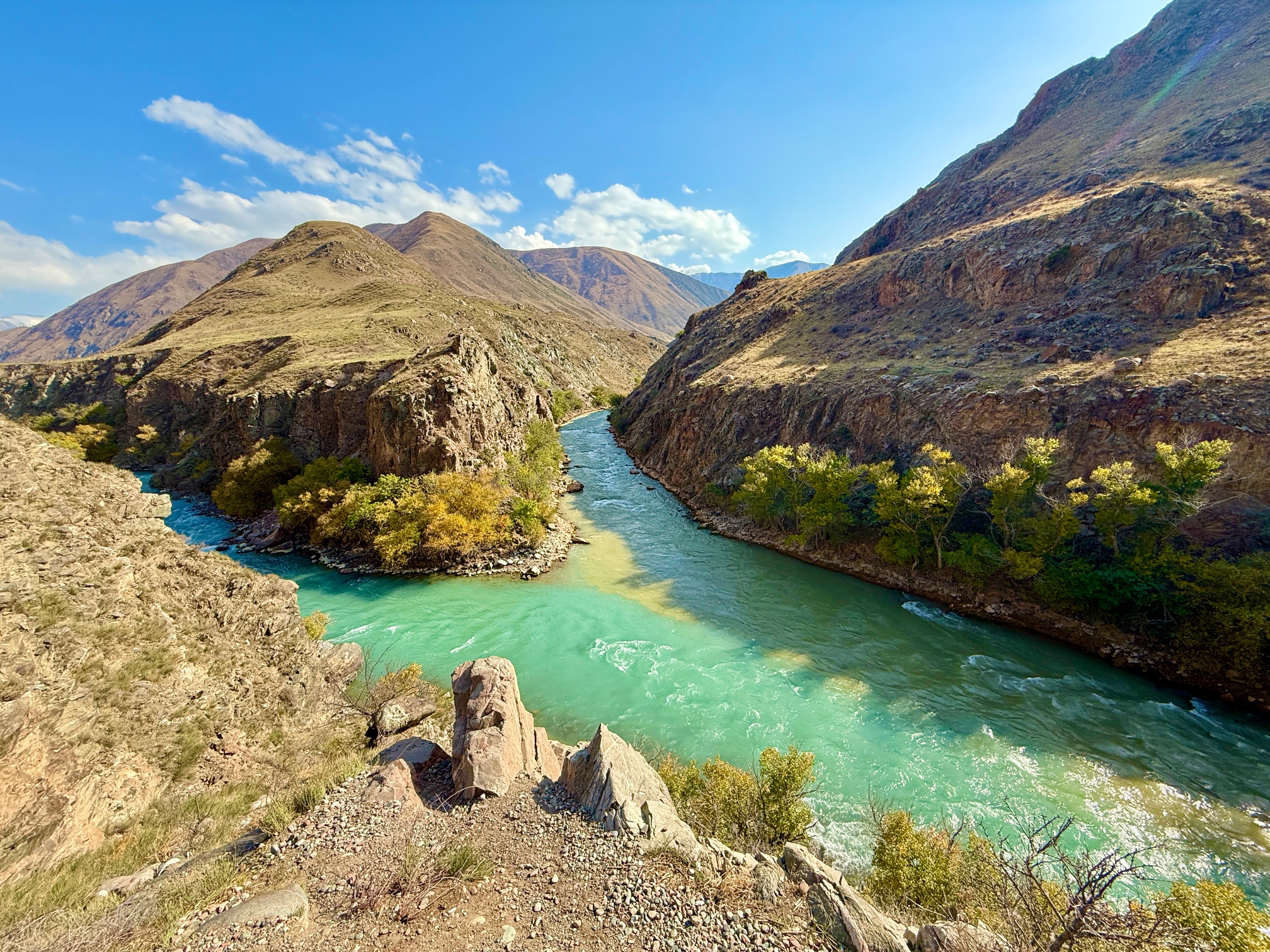 By noon depart Chon Kemin and stop at a scenic viewpoint where two alpine rivers merge — a beautiful and peaceful natural setting.