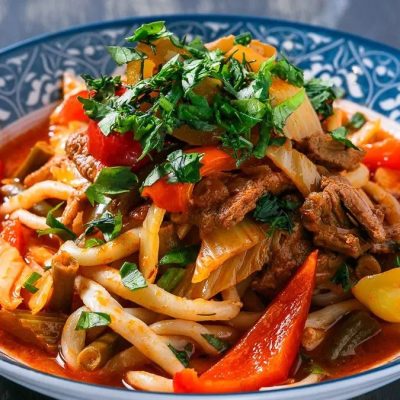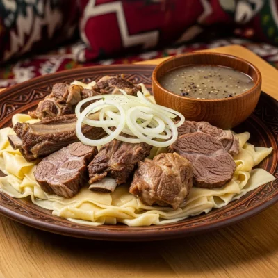A traditional Kyrgyz nomadic dish made with mutton (or other meat) cooked in its own juices for hours, then poured over hand-cut noodles.